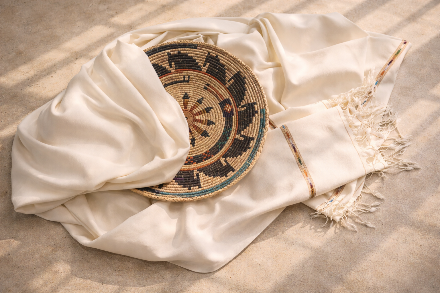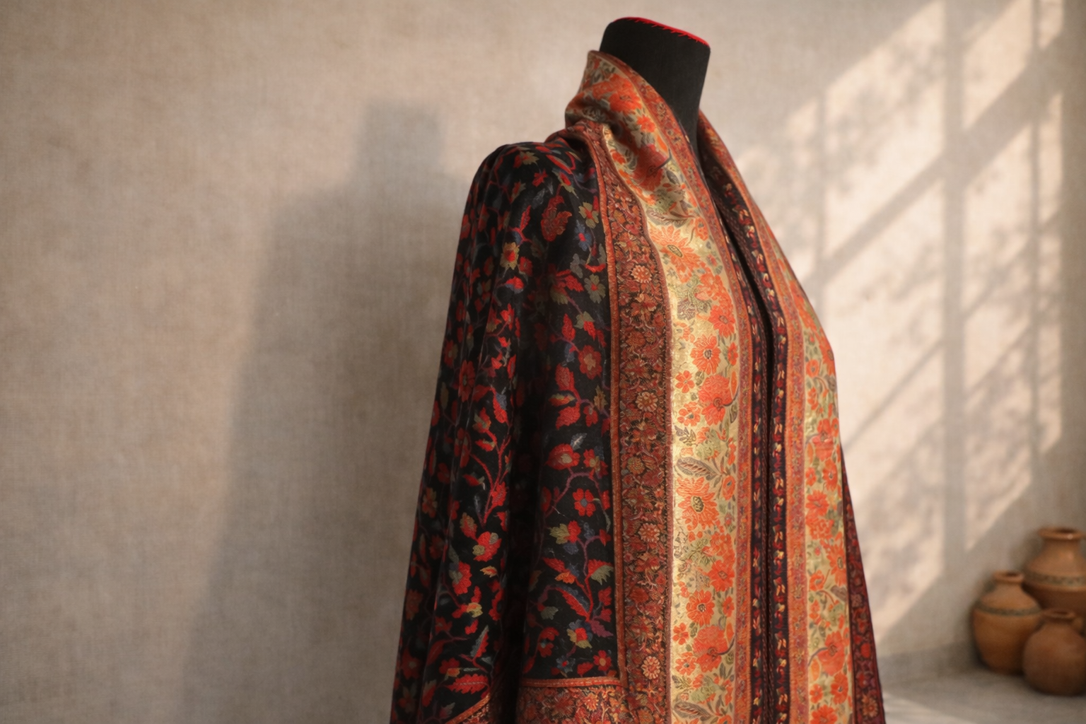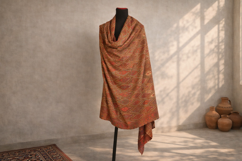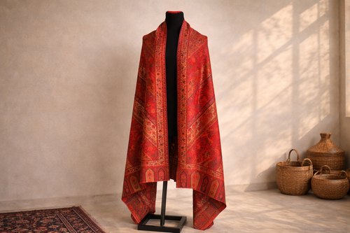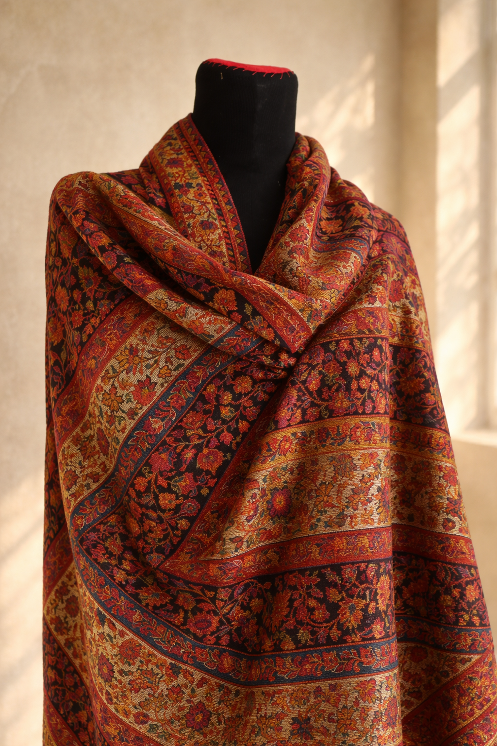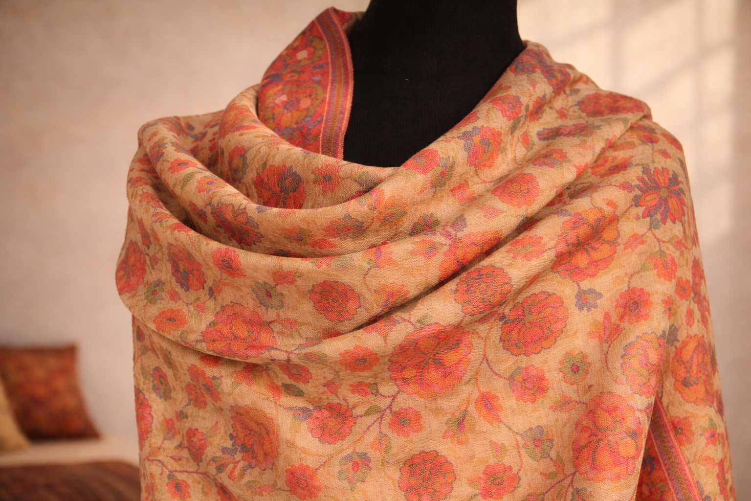 Authentic Kani Toosh Shawl - Beige with Deep Crimson and Gold Floral Stripes